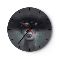 Nástěnné hodiny - Kosmické složení planet v ženské hlavě na tmavém pozadí. - 30x30cm - A planety… - Moderní nástěnná dekorace do obývacího pokoje, kuchyně a ložnice ARTTOR