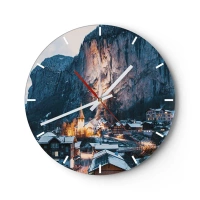 Nástěnné hodiny - Malebná vesnice na úpatí zasněžených hor ozářená teplým světlem - 30x30cm - Světlý duch zimy - Moderní nástěnná dekorace do obývacího pokoje, kuchyně a ložnice ARTTOR