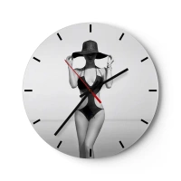 Nástěnné hodiny - Žena v černých plavkách a klobouku proti moři - 30x30cm - Jmenuji se: Elegance - Moderní nástěnná dekorace do obývacího pokoje, kuchyně a ložnice ARTTOR