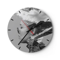 Nástěnné hodiny - Dvojitá expozice obličeje a horské krajiny v odstínech šedé. - 30x30cm - Povznešen portrét v oblacích - Moderní nástěnná dekorace do obývacího pokoje, kuchyně a ložnice ARTTOR
