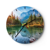 Nástěnné hodiny - Horská krajina s jezerem a lesem - 30x30cm - Něžnost podzimu - Moderní nástěnná dekorace do obývacího pokoje, kuchyně a ložnice ARTTOR