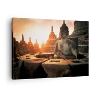 Obraz na plátně - Socha Buddhy v chrámu Borobudur při západu slunce - 70x50cm - Počasí velké moudrosti - Moderní nástěnná dekorace do obývacího pokoje a ložnice ARTTOR
