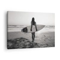 Obraz na plátně - Žena s surfovacím prknem na pláži v černé a bílé - 70x50cm - Dcera mořské vlny - Moderní nástěnná dekorace do obývacího pokoje a ložnice ARTTOR