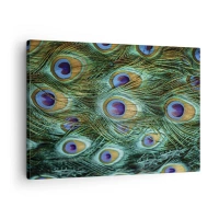 Obraz na plátně - Detaily pavích per v sytých barvách - 70x50cm - Paví pohled - Moderní nástěnná dekorace do obývacího pokoje a ložnice ARTTOR