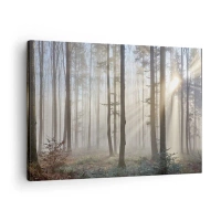 Obraz na plátně - Les v lehké mlze s paprsky slunce prosvítajícími skrz stromy - 70x50cm - Mlha se také vzbudila - Moderní nástěnná dekorace do obývacího pokoje a ložnice ARTTOR
