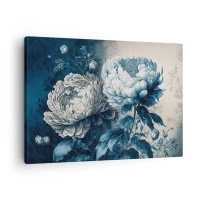 Obraz na plátně - Modré pivoňky na decentním pozadí s jemným vzorem - 70x50cm - Shodný pár - Moderní nástěnná dekorace do obývacího pokoje a ložnice ARTTOR