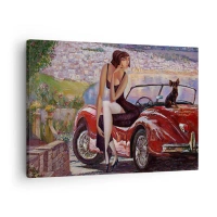 Obraz na plátně - Žena u červeného auta s městem v pozadí - 70x50cm - Léto? Jenom na Riviéře - Moderní nástěnná dekorace do obývacího pokoje a ložnice ARTTOR