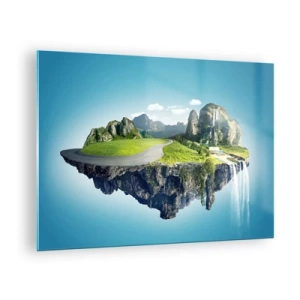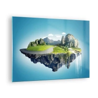 Obraz na skle - Plovoucí ostrov s horami, vodopádem a zelení - 70x50cm - Fantastický ostrov - Moderní nástěnná dekorace do obývacího pokoje a ložnice ARTTOR