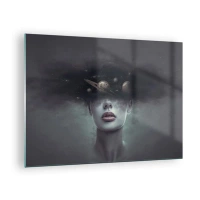 Obraz na skle - Žena s planetami místo hlavy v surrealistické kompozici - 70x50cm - A planety… - Moderní nástěnná dekorace do obývacího pokoje a ložnice ARTTOR