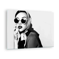 Obraz na skle - Stylová žena v brýlích a černobílém šátku - 70x50cm - Pozdravy z 60. let - Moderní nástěnná dekorace do obývacího pokoje a ložnice ARTTOR
