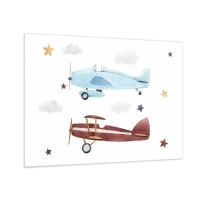 Obraz na skle - Dvě barevná letadla mezi hvězdami a mraky - 70x50cm - Pane pilote, čekáme! - Moderní nástěnná dekorace do obývacího pokoje a ložnice ARTTOR