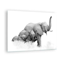 Obraz na skle - Rodina černých a bílých slonů v přírodě - 70x50cm - Jedna, dvě, tři - Moderní nástěnná dekorace do obývacího pokoje a ložnice ARTTOR
