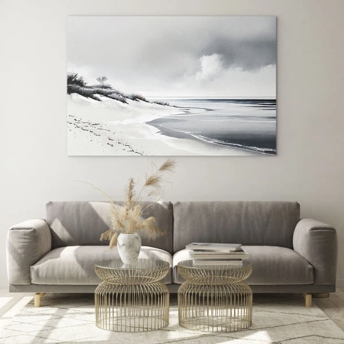 Obraz na skle - Černá a bílá pláž s horizontem a klidným mořem - 70x50cm - Vždycky spolu - Moderní nástěnná dekorace do obývacího pokoje a ložnice ARTTOR