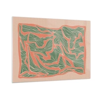 Obraz na skle - Zelené listové formy obklopené korálovým rámem na béžovém pozadí - 70x50cm - Souboj korálů a zeleně - Moderní nástěnná dekorace do obývacího pokoje a ložnice ARTTOR
