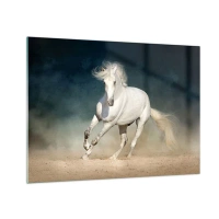 Obraz na skle - Bílý kůň cválající po písku proti tmavé obloze. - 70x50cm - Svoboda v čistém stavu - Moderní nástěnná dekorace do obývacího pokoje a ložnice ARTTOR