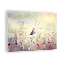 Obraz na skle - Pták na květinové louce na slunci - 70x50cm - Portrét ptáka s loukou v pozadí - Moderní nástěnná dekorace do obývacího pokoje a ložnice ARTTOR