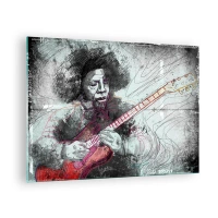 Obraz na skle - Umělecký portrét hudebníka s elektrickou kytarou - 70x50cm - Na vlnách hudby - Moderní nástěnná dekorace do obývacího pokoje a ložnice ARTTOR