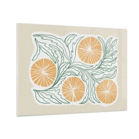 Obraz na skle - Oranžové plody a zelené listy v grafické kompozici - 70x50cm - Etnický s abstraktním nádechem - Moderní nástěnná dekorace do obývacího pokoje a ložnice ARTTOR