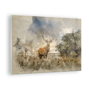 Obraz na skle - Jelen v přírodní krajině s jemnými barvami v pozadí - 70x50cm - Důstojnost - síla - majestátnost - Moderní nástěnná dekorace do obývacího pokoje a ložnice ARTTOR