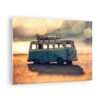 Obraz na skle - Retro hračkářský autobus na pláži při západu slunce - 70x50cm - Konec bůžků: peněz a práce - Moderní nástěnná dekorace do obývacího pokoje a ložnice ARTTOR