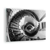 Obraz na skle - Černobílá fotografie točitého schodiště v perspektivě - 70x50cm - Jen výš a výš - Moderní nástěnná dekorace do obývacího pokoje a ložnice ARTTOR