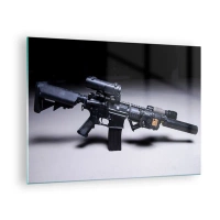 Obraz na skle - Černá útočná puška s příslušenstvím ležící na světlém pozadí - 70x50cm - Temný rytíř - Moderní nástěnná dekorace do obývacího pokoje a ložnice ARTTOR
