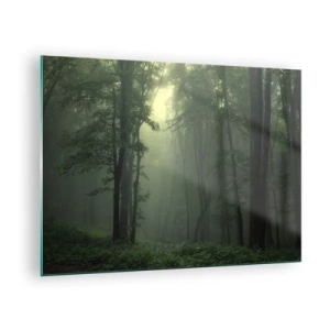 Obraz na skle - Temný les zahalený v mlze s paprsky světla - 70x50cm - Než se probudí - Moderní nástěnná dekorace do obývacího pokoje a ložnice ARTTOR
