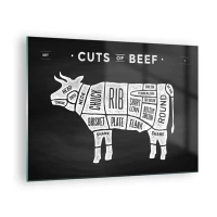 Obraz na skle - Hovězí řez diagram na černé tabuli - 70x50cm - Slabikář řezníka - Moderní nástěnná dekorace do obývacího pokoje a ložnice ARTTOR