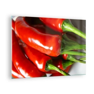 Obraz na skle - Červené chilli papričky se zelenými stonky - 70x50cm - Šťavnaté, lesklé, hladké - Moderní nástěnná dekorace do obývacího pokoje a ložnice ARTTOR