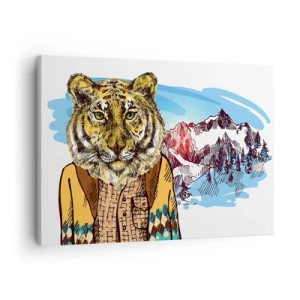 Obraz na plátně - Tygr v kabátě na pozadí horské krajiny - 70x50cm - Není tak divoký jak ho kreslí - Moderní nástěnná dekorace do obývacího pokoje a ložnice ARTTOR