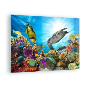 Obraz na skle - Podvodní scéna s želvou, rybami a korály - 70x50cm - Korálová promenáda - Moderní nástěnná dekorace do obývacího pokoje a ložnice ARTTOR