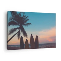 Obraz na plátně - Surfovací prkna na pozadí palmy a západu slunce - 70x50cm - Zítra bude také zábava - Moderní nástěnná dekorace do obývacího pokoje a ložnice ARTTOR