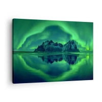 Obraz na plátně - Hory obklopené polární záři odrážející se ve vodě - 70x50cm - V náručí polární záře - Moderní nástěnná dekorace do obývacího pokoje a ložnice ARTTOR