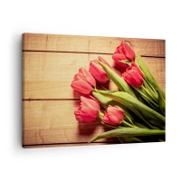 Obraz na plátně - Kytice růžových tulipánů na dřevěném pozadí - 70x50cm - Jarní vyznání - Moderní nástěnná dekorace do obývacího pokoje a ložnice ARTTOR