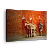 Obraz na plátně - Čtyři žirafy u cihlové zdi v uměleckém prostředí - 70x50cm - Vidíte nějaký akát? - Moderní nástěnná dekorace do obývacího pokoje a ložnice ARTTOR