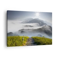 Obraz na plátně - Dřevěná cesta mezi mlhavými horami ráno - 70x50cm - Utkané ze záře a mlhy - Moderní nástěnná dekorace do obývacího pokoje a ložnice ARTTOR