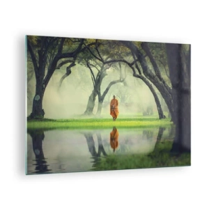 Obraz na skle - Mnich v oranžovém rouchu se prochází mezi stromy u vody - 70x50cm - Na cestě k osvícení - Moderní nástěnná dekorace do obývacího pokoje a ložnice ARTTOR