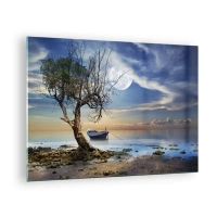 Obraz na skle - Osamělá loď u stromu na pozadí měsíce - 70x50cm - Je to konec nebo začátek? - Moderní nástěnná dekorace do obývacího pokoje a ložnice ARTTOR