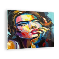 Obraz na skle - Barevný portrét ženy v abstraktním stylu - 70x50cm - Naše první tajemství - Moderní nástěnná dekorace do obývacího pokoje a ložnice ARTTOR