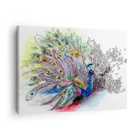 Obraz na plátně - Páv v barevném akvarelovém stylu s abstraktním peřím - 70x50cm - S pýchou proti šedi - Moderní nástěnná dekorace do obývacího pokoje a ložnice ARTTOR