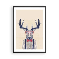 Plakát v černém rámu - Stylový jelen s brýlemi a motýlkem na béžovém pozadí - 50x70cm - Zábavná extravagance - Moderní nástěnná dekorace do obývacího pokoje a ložnice ARTTOR