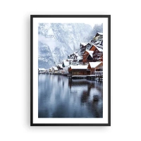 Plakát v černém rámu - Zimní krajina horské vesnice u jezera - 50x70cm - V zimní dekoraci - Moderní nástěnná dekorace do obývacího pokoje a ložnice ARTTOR