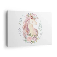 Obraz na plátně - Jednorožec v pastelových barvách obklopený květinami - 70x50cm - Pozvánka do říše pohádek - Moderní nástěnná dekorace do obývacího pokoje a ložnice ARTTOR