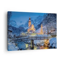 Obraz na plátně - Zimní krajina s kostelem, mostem a horami za soumraku - 70x50cm - Duch Vánoc - Moderní nástěnná dekorace do obývacího pokoje a ložnice ARTTOR