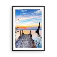 Plakát v černém rámu - Jezerní molo při západu slunce - 50x70cm - Dobrý večer - Moderní nástěnná dekorace do obývacího pokoje a ložnice ARTTOR