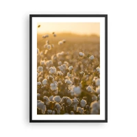 Plakát v černém rámu - Bavlníkové pole v teplém světle zapadajícího slunce - 50x70cm - Chlupaté pole - Moderní nástěnná dekorace do obývacího pokoje a ložnice ARTTOR