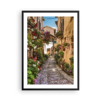 Plakát v černém rámu - Okouzlující ulice s květinami a dlážděnou cestou za slunečného dne - 50x70cm - Italské zákoutí - Moderní nástěnná dekorace do obývacího pokoje a ložnice ARTTOR