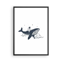 Plakát v černém rámu - Akvarelová vzducholoď plovoucí mezi hvězdami a mraky. - 50x70cm - Vzducholoď - Moderní nástěnná dekorace do obývacího pokoje a ložnice ARTTOR