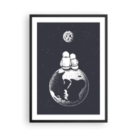 Plakát v černém rámu - Astronauti sedící na Zemi a dívající se na Měsíc - 50x70cm - Vesmírná love story - Moderní nástěnná dekorace do obývacího pokoje a ložnice ARTTOR