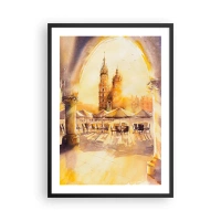 Plakát v černém rámu - Akvarel zobrazující krakovské náměstí při západu slunce. - 50x70cm - Východ slunce nad krakovským náměstím - Moderní nástěnná dekorace do obývacího pokoje a ložnice ARTTOR